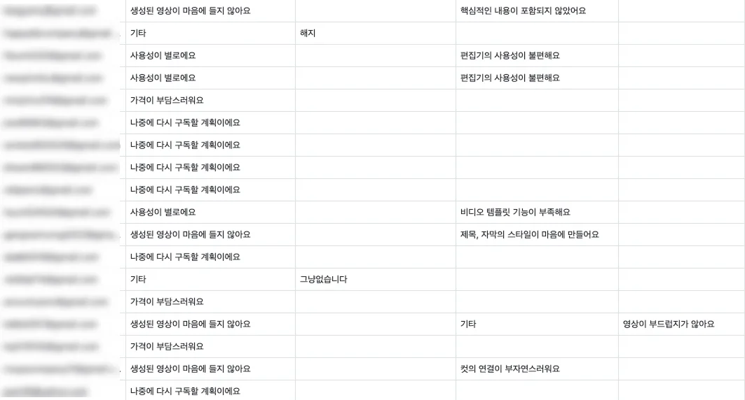 사용자가 서비스를 해지할 때 반드시 구독 취소 사유를 입력하도록 하고 있습니다. 신규 고객의 의견도 중요하지만, 이탈 유저의 목소리야말로 서비스 개선의 핵심 지표이기 때문입니다.