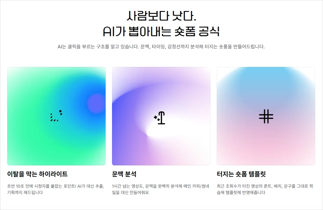 단순히 말이 많은 부분이나 장면 전환이 많은 구간을 잘라내는 것이 아니라, 실제로 반응이 날 가능성이 높은 구간을 구조적으로 분석해 숏폼을 구성합니다.