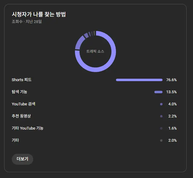 조회수가 정체될 때 추가로 확인해야 할 항목은 트래픽 소스(유입 경로)입니다. 분석 탭을 보면 사람들이 홈, 추천, 검색, 쇼츠, 외부 유입 등 어떤 경로를 통해 영상을 시청했는지를 확인할 수 있습니다.