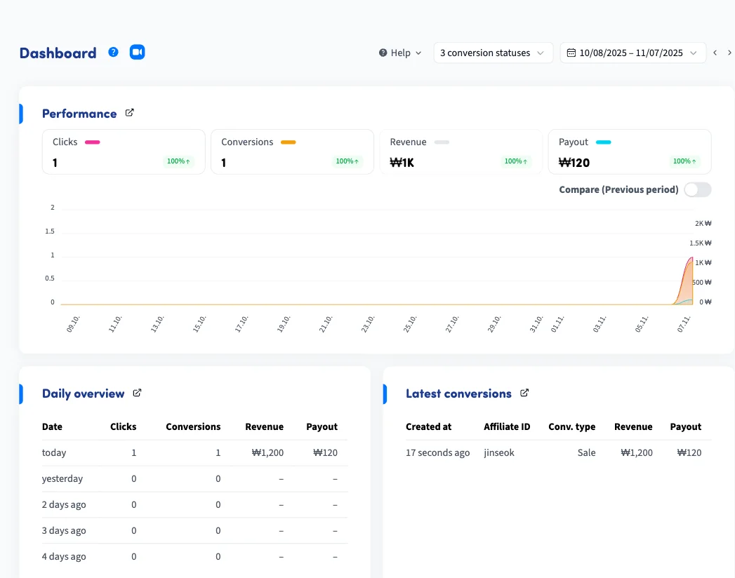 정상적으로 입력되었다면 대쉬보드 페이지로 넘어오게 돼요. 해당 페이지에서 내가 공유한 링크가 얼마나 클릭되었는지, 얼마나 결제되었는지, 얼마나 정산받을 수 있는지 확인할 수 있어요