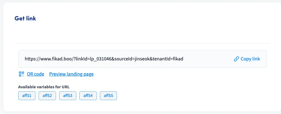 해당 offer list 중 fika clip afiiliate에서 “Get link”를 클릭해주세요