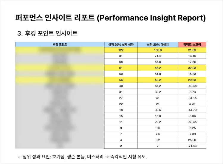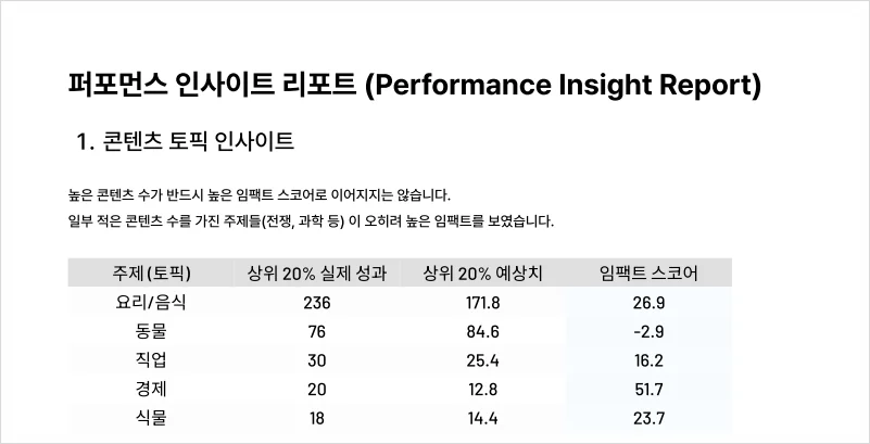 성과 높은 주제 도출 : 실제 성과가 좋았던 콘텐츠 주제를 분석해 데이터 기반 콘텐츠 패턴 확인