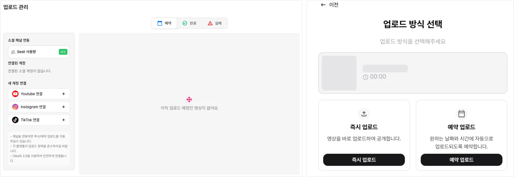 편집이 완료된 숏폼 콘텐츠를 유튜브, 인스타그램, 틱톡 등 다양한 플랫폼에 바로 업로드할 수 있는 기능입니다.
