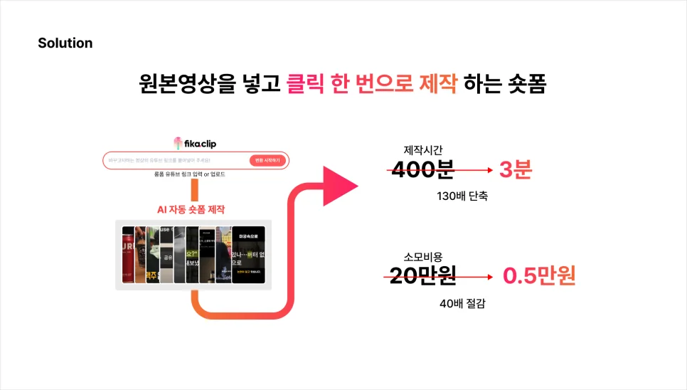 👉 하나의 롱폼을 여러 개의 숏폼으로 변환하는 데 기존에는 약 400분이 소요되었다면, 피카클립을 활용할 경우 약 3분대로 단축할 수 있습니다.