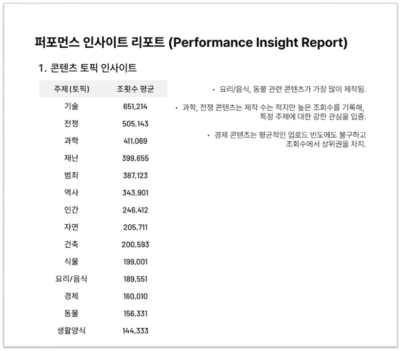 퍼포먼스 인사이트 리포트 : 많이 제작된 주제, 평균 조회수가 높은 카테고리 등 분석